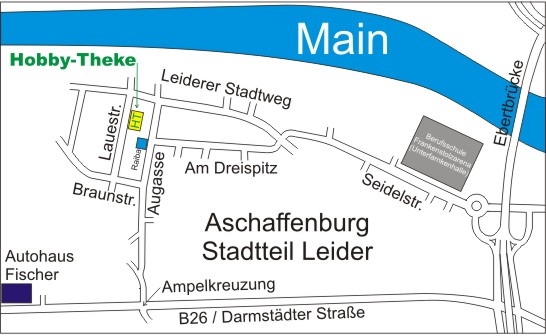 An der zweiten Ausfahrt (Darmstadt) fahrt Ihr von der B469 ab auf die B26 Richtung Aschaffenburg. Nach ca. 5km kommt auf der rechten Seite das Autohaus Fischer, an der Ampelkreuzung nach dem Autohaus biegt Ihr links ab und dann geht es gleich wieder rechts weg in den Stadtteil Leider. In Leider dann die zweite links abbiegen in die Braunstraße und dann gleich wieder rechts in die Lauestraße. Jetzt noch ca. 200m und Ihr seht auf der rechten Seite die Hobby-Theke Aschaffenburg. Die Strecke befindet sich über dem Geschäft im Dachgeschoss.